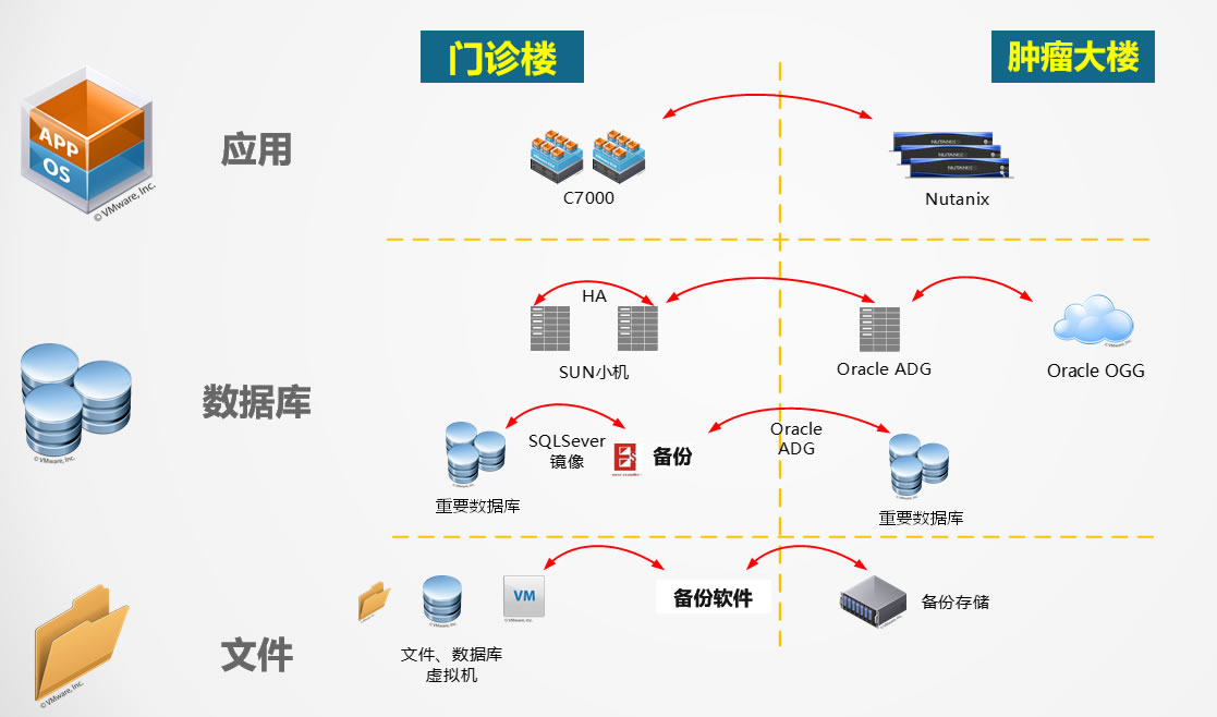 全院的容灾备份体系,则已趋近完成,由两个平台进行数据的备份,全院除影像应用及数据外的,其他所有操作系统、数据库、虚拟机由一个备份平台完成,影像应用及数据则由此次项目建设新增的一套备份平台完成,这样既可以对备份服务器、代理进行压力分摊,又可以减轻运维的压力,避免在同一平台,因备份任务过多,造成备份效率不高,以及增加运维难度。